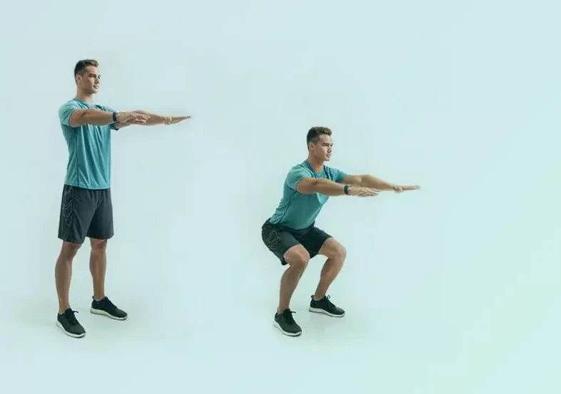 - زانوها را خم کنید و همزمان باسن را به عقب و پایین ببرید، طوریکه تا حد امکان به زمین نزدیک شوید.
