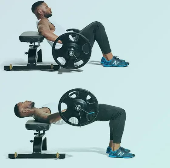 حرکت هیپ تراست (Hip Thrust) یکی از بهترین تمرینها برای تقویت عضلات باسن و لگن است. برای انجام این حرکت، به پشت روی زمین یا نیمکت بنشینید بهطوریکه قسمت فوقانی پشت (کتف و شانهها) روی نیمکت تکیه داشته باشد. زانوهای خود را خم کنید تا زاویهای حدود ۹۰ درجه با زمین ایجاد شود.